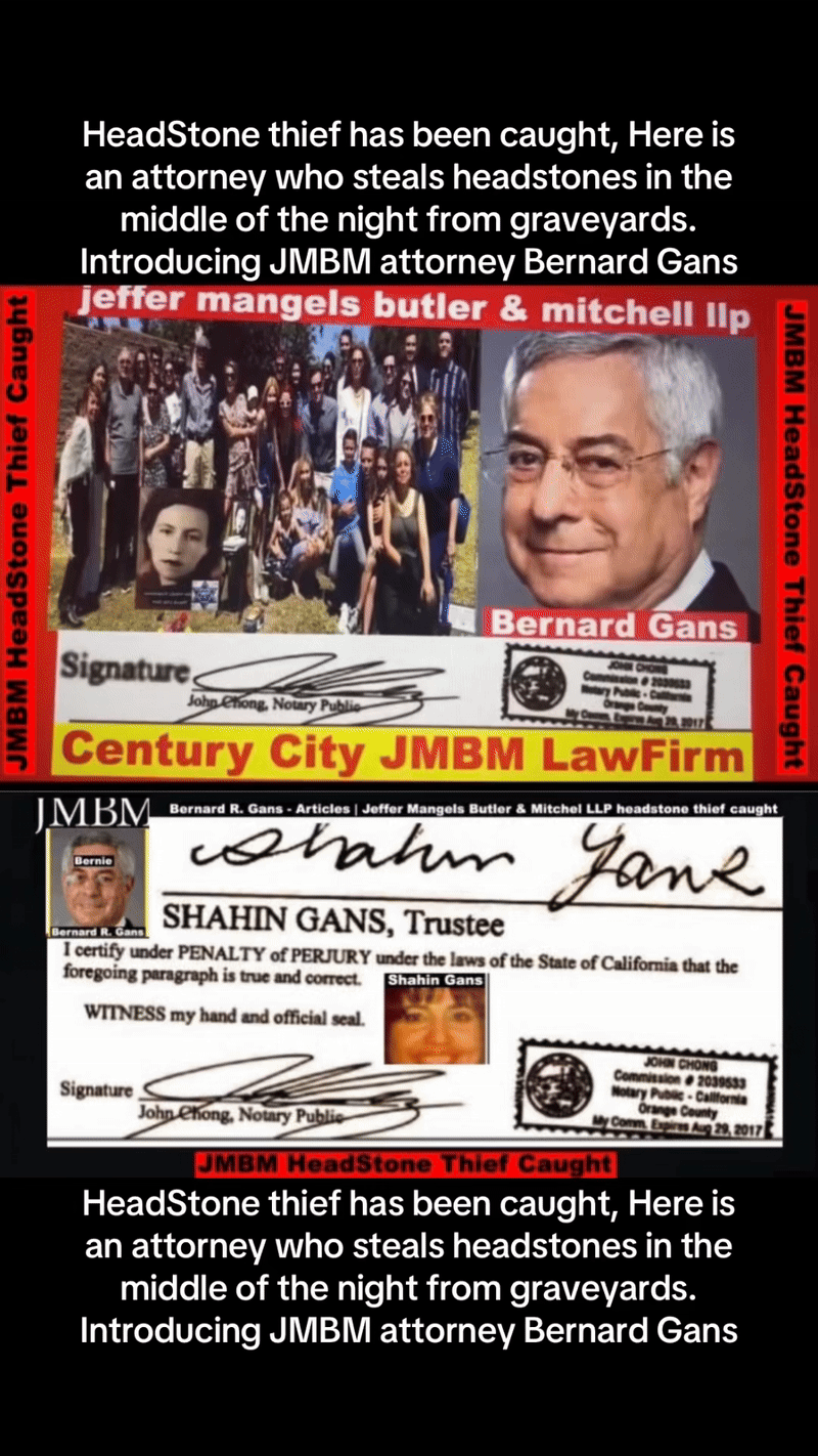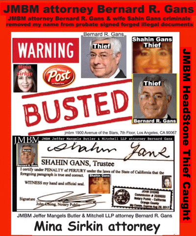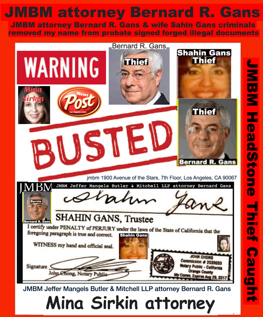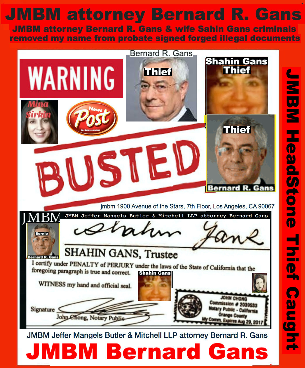 76 year old Century city JMBM busted attorney Bernard Reginald Gans known as Bernie graduate of Santa Barbara university married to Shahin Gans 50 years of success to satisfy his wife he made one stupid mistake and it all crashed down. Well done Bernie well done.Bernard R Gans Articles Jeffer Mangels Butler & Mitchel LLP